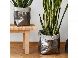 Эта большая версия сумки идеально подходит для хранения различных вещей, таких как книги или журналы, но, по нашему мнению, она особенно привлекательна для растений. Сумка изготовлена из прочной, пропитанной и моющейся целлюлозы. Особый производственный процесс делает ее похожую на кожу, поскольку бумага растягивается и дубится, что придает ей мягкость и прочность, позволяющую выдерживать стирку.