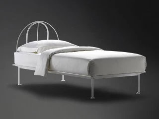 Кровать с каркасом из лакированного алюминия серого или белого цвета для современного и стильного интерьера спальни. Изголовье полукруглой формы может быть дополнено съемным чехлом. База снабжена регулируемыми рейками.