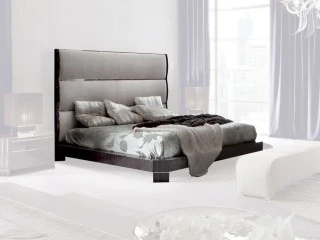 Ліжко з шпону капа тамос японського мока і глянцевого поліестеру. Узголів'я в шкірі. Ніжки та деталі з хромованої нержавіючої сталі.