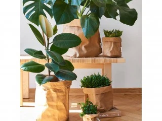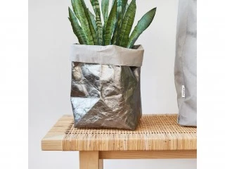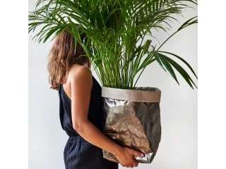 Сумка розміру «S» ідеально підходить для зберігання дрібних речей, але, на нашу думку вона особливо приваблива в якості прикриття для квіткового горщика. Сумка виготовлена з міцної, просоченої і миючої целюлози. Особливий виробничий процес робить її схожу на шкіру, оскільки папір розтягується і дубиться, що надає їй м'якість і міцність, що дозволяє витримувати прання.