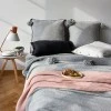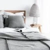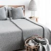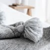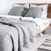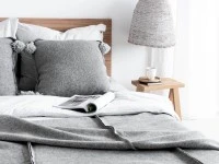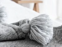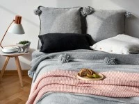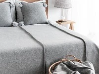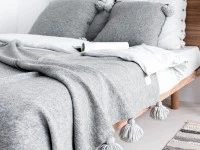 Двоспальне покривало виготовлено з м'якої трикотажної вовняної тканини. Необроблена обробка швів підкреслює фактуру матеріалу. Простий дизайн робить покривало відповідним для будь-якого інтер'єру. Декоративні масивні помпони на обох кінцях покривала надають йому неповторний характер.