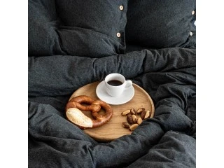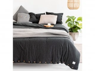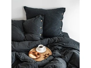 Комплект постільної білизни з дуже м'якого трикотажу кольору графітовий меланж. Натуральна тканина дозволяє шкірі дихати, а постільна білизна так само приємна на дотик, як і ваша улюблена футболка. Наволочки і підковдра застібаються на гудзики з натурального дерева. Вам він сподобається з першого дотику.