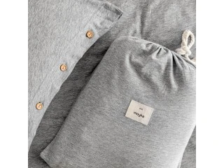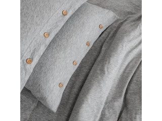 Комплект постільної білизни з дуже м'якого трикотажу світло-сірого кольору меланж. Натуральна тканина дозволяє шкірі дихати, а постільна білизна так само приємна на дотик, як і ваша улюблена футболка. Наволочки та пухові ковдри застібаються на гудзики з натурального дерева. Вам він сподобається з першого дотику.